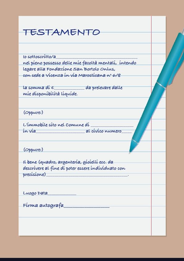 Chi volesse beneficiare la Fondazione con un testamento può farlo ricorrendo al notaio di propria fiducia o più semplicemente predisponendo un testamento olografo. Questo può contenere anche solo la disposizione a favore della Fondazione. In questo ultimo caso si aprirebbe per tutti gli altri beni la successione legittima, cioè i beni non lasciati alla Fondazione saranno devoluti secondo legge. Qualora si optasse per il testamento olografo, questo deve essere scritto interamente di pugno dal testatore con data e sottoscrizione dello stesso. Non servono particolari formalità.